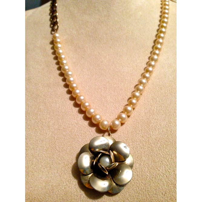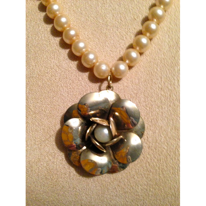 This pearl and gold necklace is off set. More pearls on one side making it unique. I love the center pearl in the rose bloom pendant. If you look close you can see me photographing the piece with my cell phone.