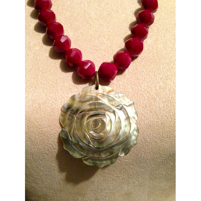 Mother of Pearl Rose Bloom Pendant on Red Bead and Chain Necklace