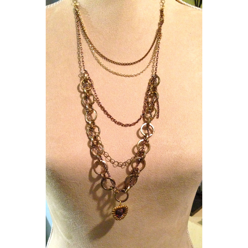 Many levels of chain enter twined thru the chunky chain that leads to the purple heart pendant. This is a one of a kind. Enjoy it.
