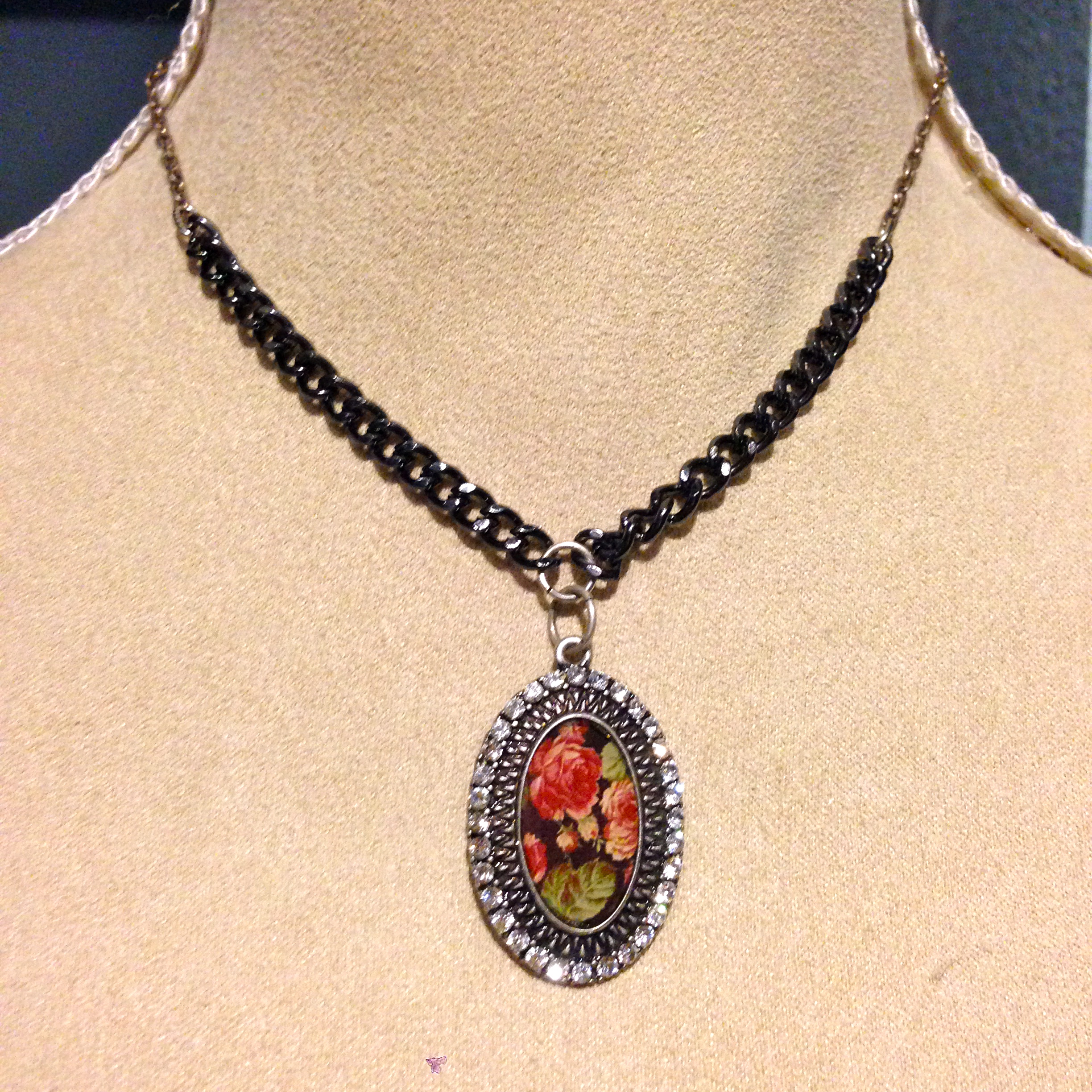 Short chain anchored by the oval floral pendant. A classic everyday piece.